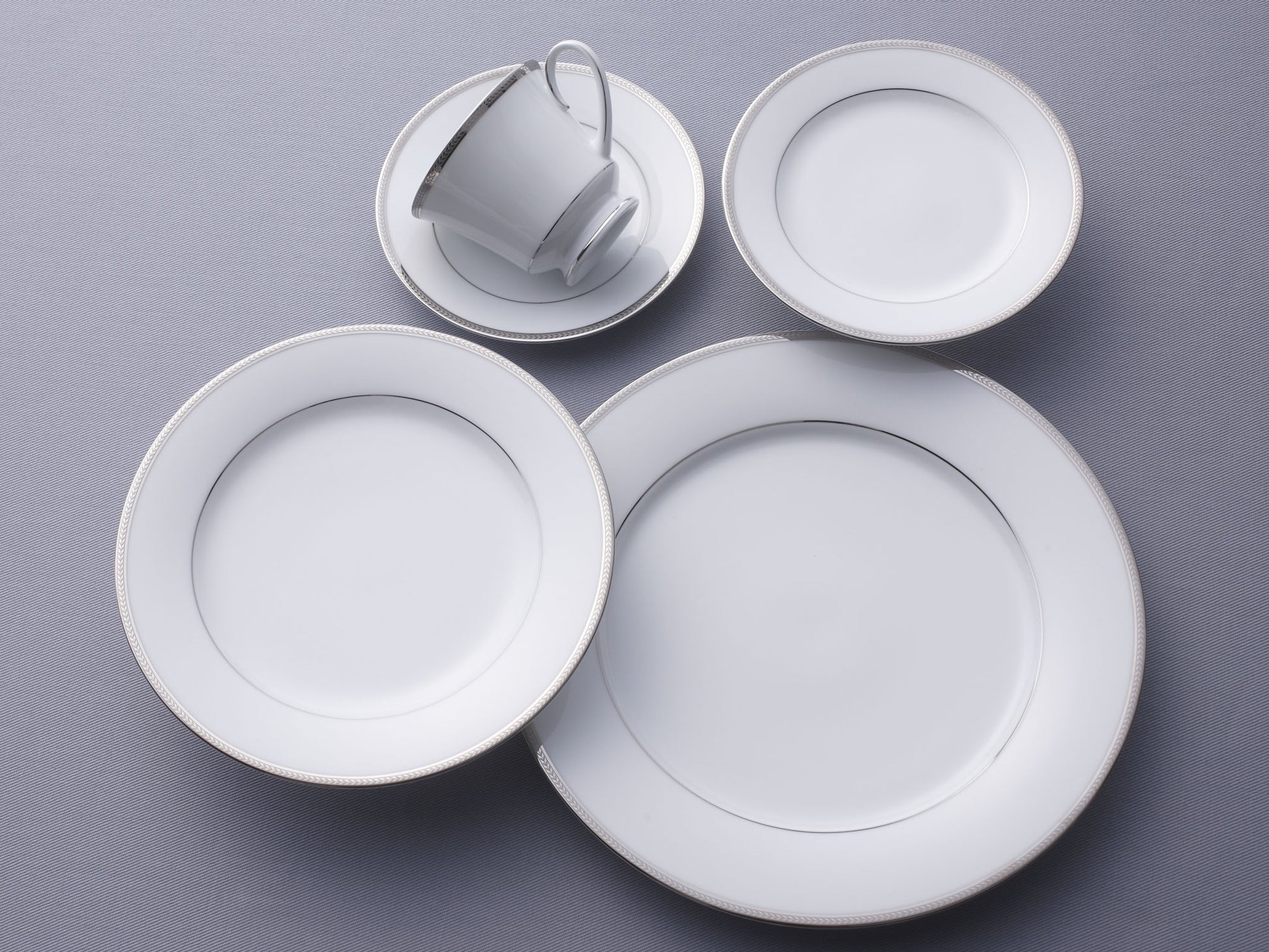 An elegant formal design with crisp bank of black on a white fine porcelain, accentuated by platinum lines. It is chip resistant as well.